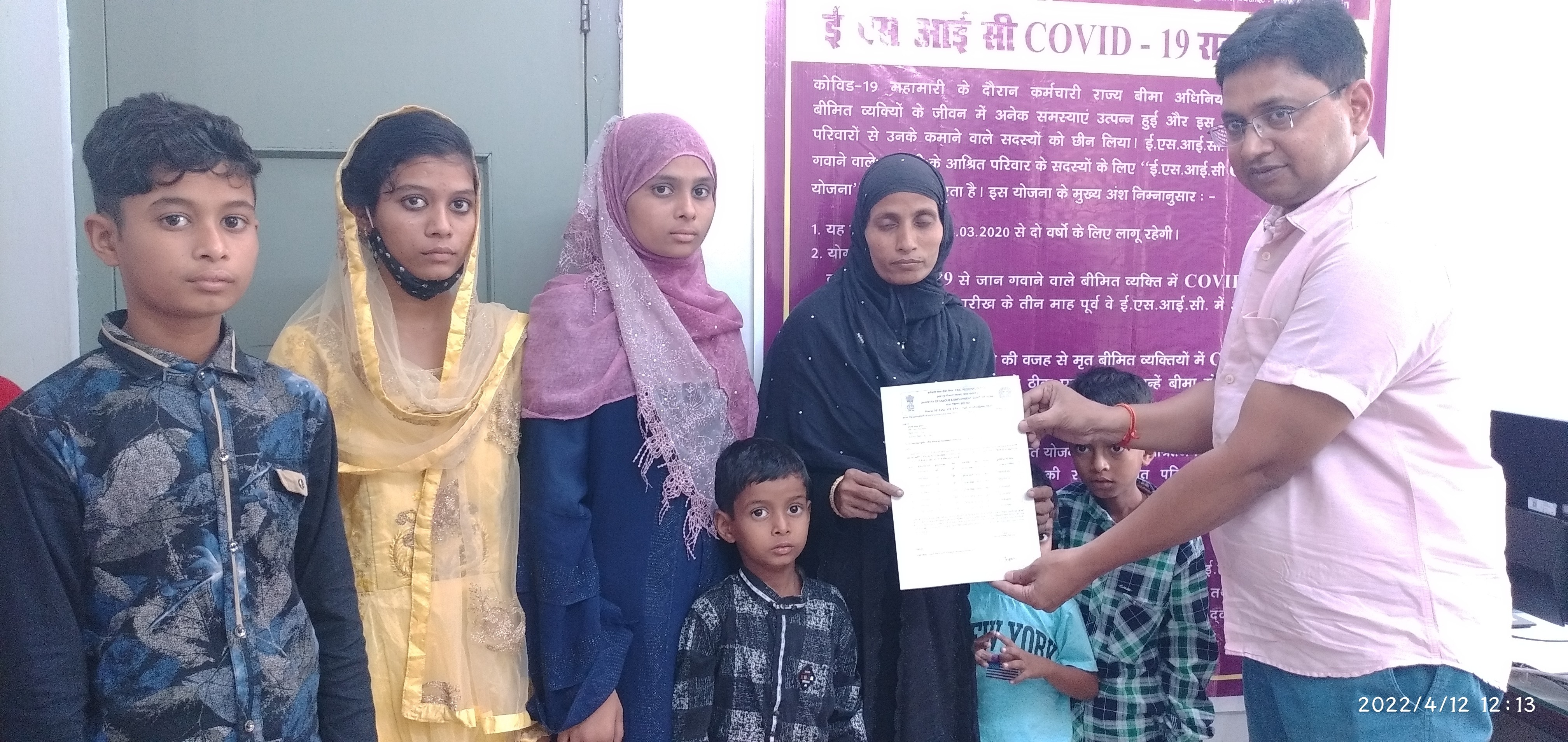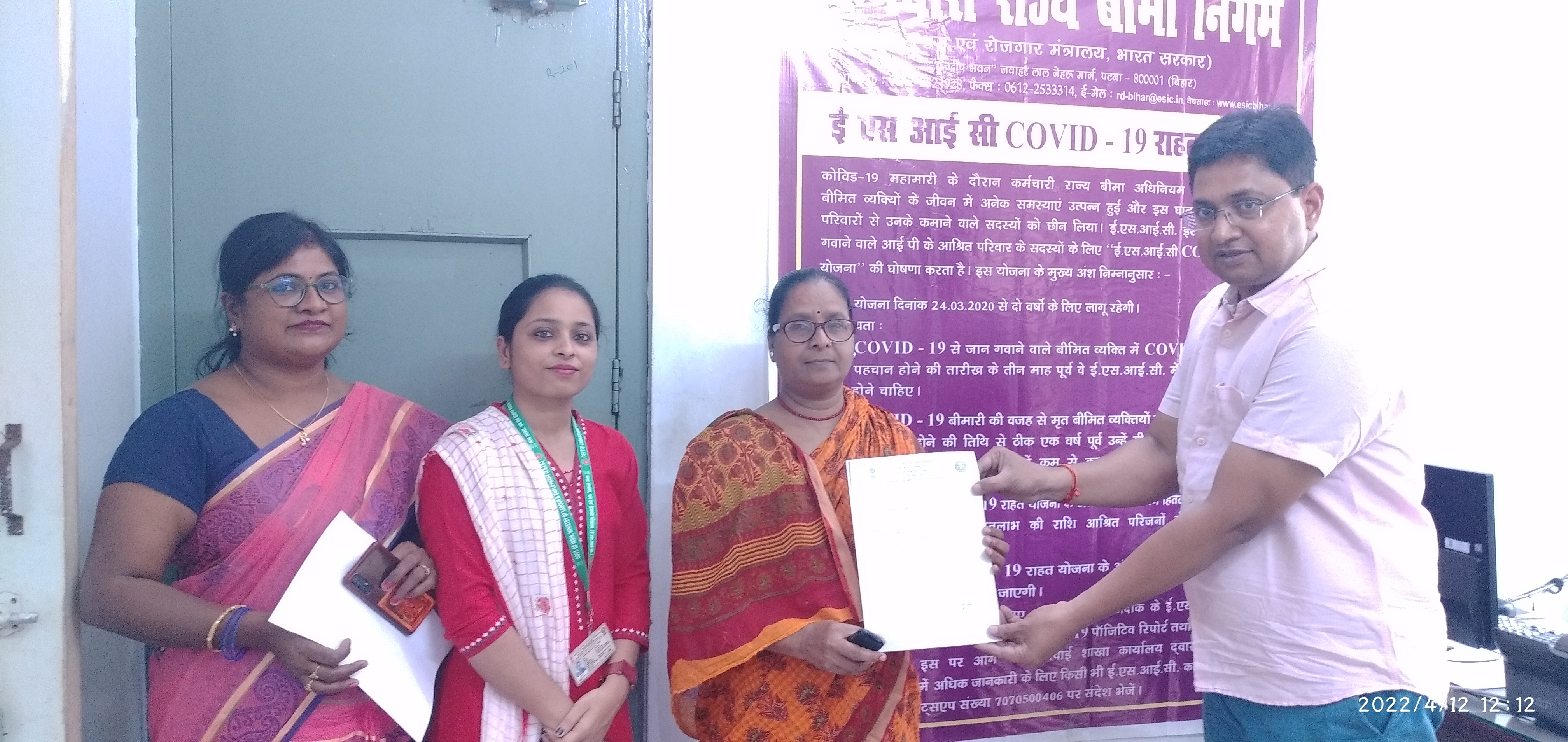 12 अप्रैल 2022 को क्षेत्रीय कार्यालय में क्षेत्रीय निदेशक महोदय द्वारा बीमित के आश्रितों को कोविड -19 रिलीफ स्कीम के तहत हितलाभ प्रदान किया गया