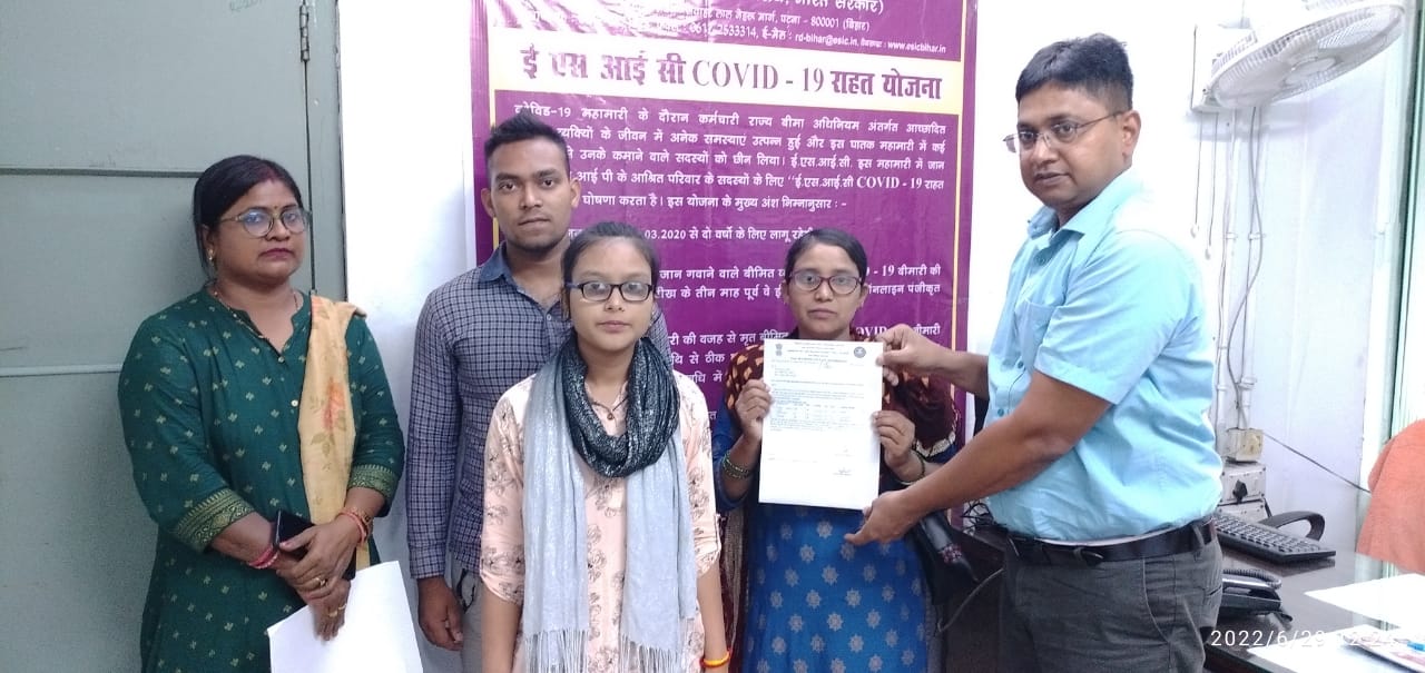 24 अगस्त 2022 को क्षेत्रीय कार्यालय में क्षेत्रीय निदेशक महोदय द्वारा बीमित के आश्रितों को कोविड -19 रिलीफ स्कीम के तहत हितलाभ प्रदान किया गया