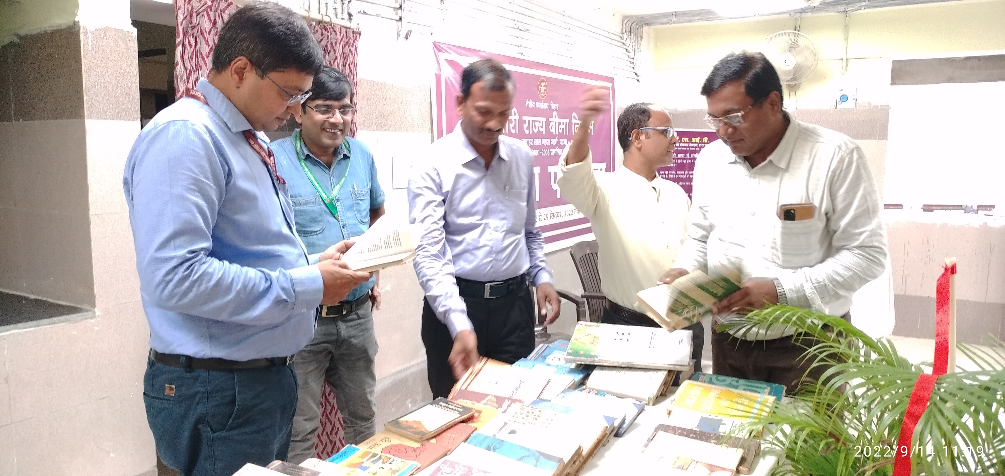 राजभाषा पखवाडा कार्यक्रम में लगे पुस्तकों को देखते अधिकारीगण एवं पदाधिकारीगण